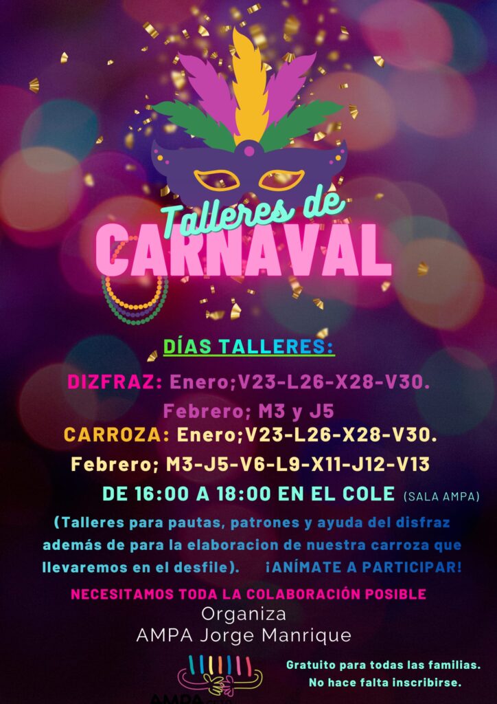 Desde el AMPA CEIP Jorge Manrique os invitamos a participar un año más en nuestro Carnaval 2026, que este curso tendrá como temática “Un cole de cuento”.